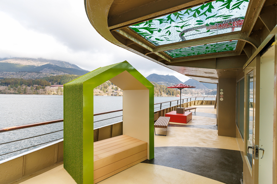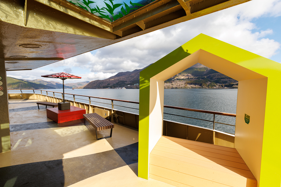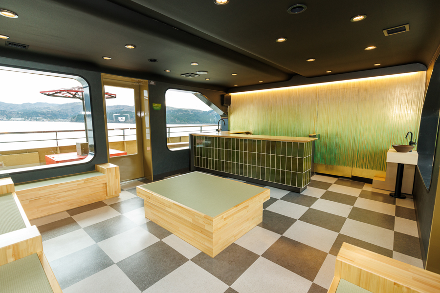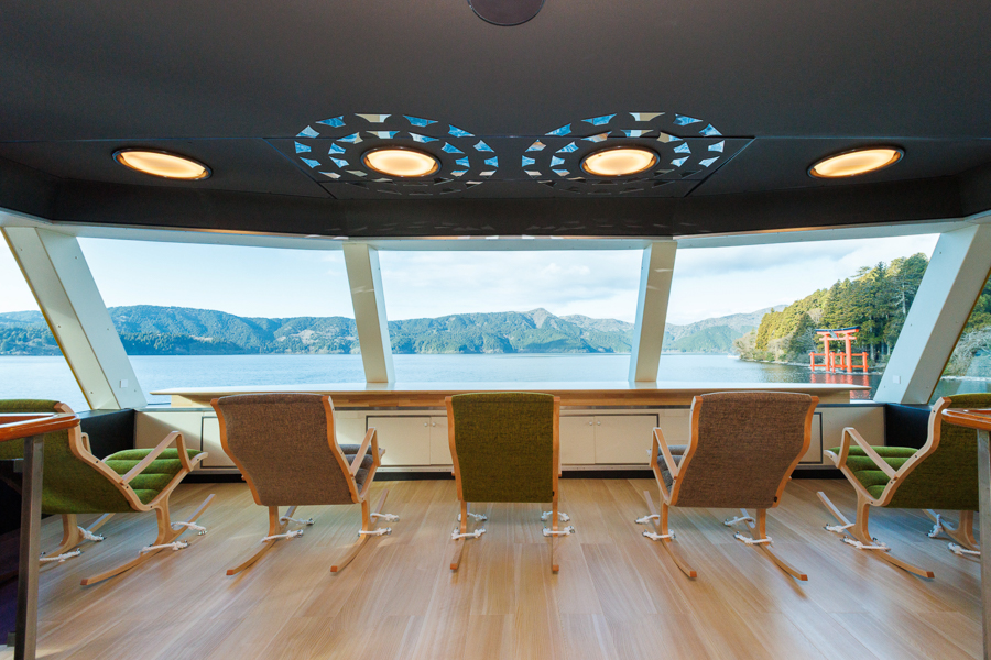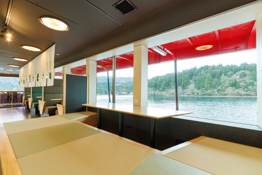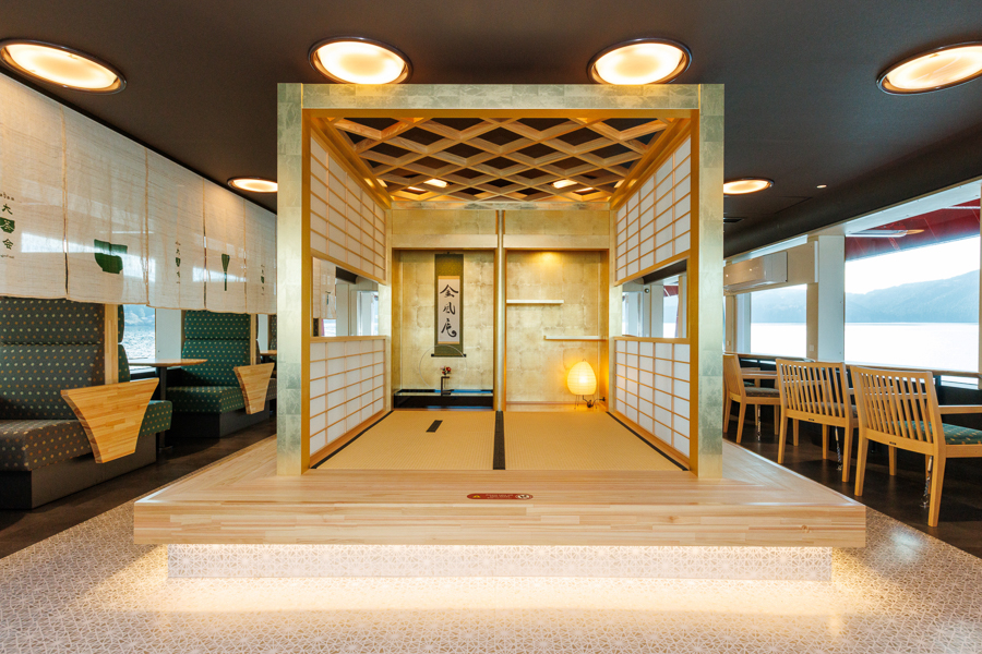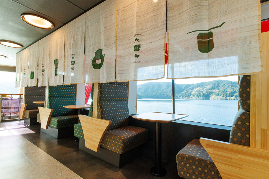 季節ごとに表情を変える芦ノ湖の景観を背景に、まるで茶室を巡るように船内を回遊しながら、