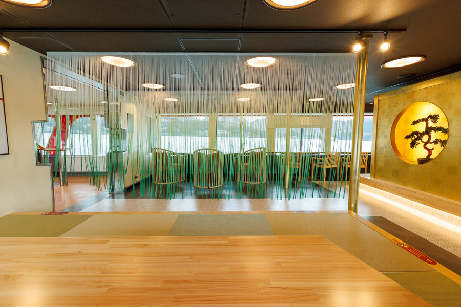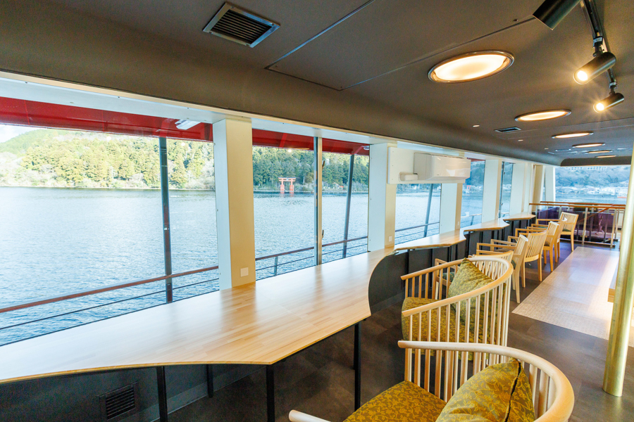 季節ごとに表情を変える芦ノ湖の景観を背景に、まるで茶室を巡るように船内を回遊しながら、